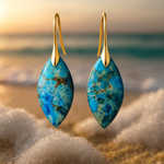 The Avelina earrings capture the charm of Elafonissi beach in Crete, where the sea changes its color to green. The radiant turquoise hue, interwoven with golden and sandy veins, reflects the crystal-clear water that touches the pink shore. These stones add light and depth to any look.